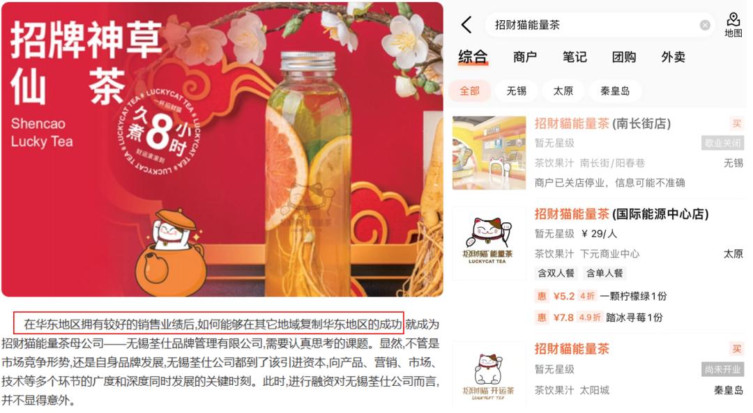 企媒创氪同样也在3月发布招财猫能量茶母公司“无锡荃仕品牌管理有限公司”,获得A轮5000万融资的消息,文章中提到“在华东地区拥有较好的销售业绩”,但在大众点评上,切换到无锡,可以发现无锡的门店已经歇业关闭,在营门店只有太原一家,秦皇岛门店尚未开业。实际状况似乎与报道并不匹配。