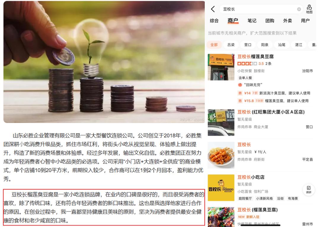 查询大众点评可以发现,豆校长榴莲臭豆腐的门店分布也并不寻常,门店分布于营口、吕梁、汕尾、永康、大连、重庆等等。每个城市仅有1家门店,寥若晨星。与一般餐饮连锁的开店逻辑并不相符。