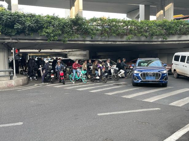 路边摊贩告诉出行一客,这些穿着绿马甲、拿着小红旗、马甲上带有“执勤”字眼的人员,是交通协管的志愿者。他们分别站在十字路口的转弯处,拦下在机动车道上行驶的电动自行车,进行劝导。