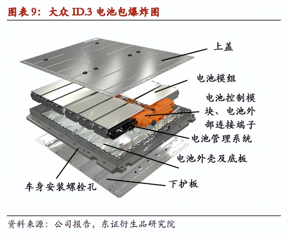 在结构上,动力电池经过了多轮"进化"。行业最早的结构是MTP(Module to Pack),这种结构奠定了动力电池的结构雏形,包括电芯、模组和电池包三部分。一个模组由多个电芯组成,多个模组加上BMS、配重模块等零部件组成一个电池包,然后装在车内。大众 ID.3 使用的就是MTP结构电池,其电池包由壳体、电池模组、电池控制模块和电池管理系统等组成。