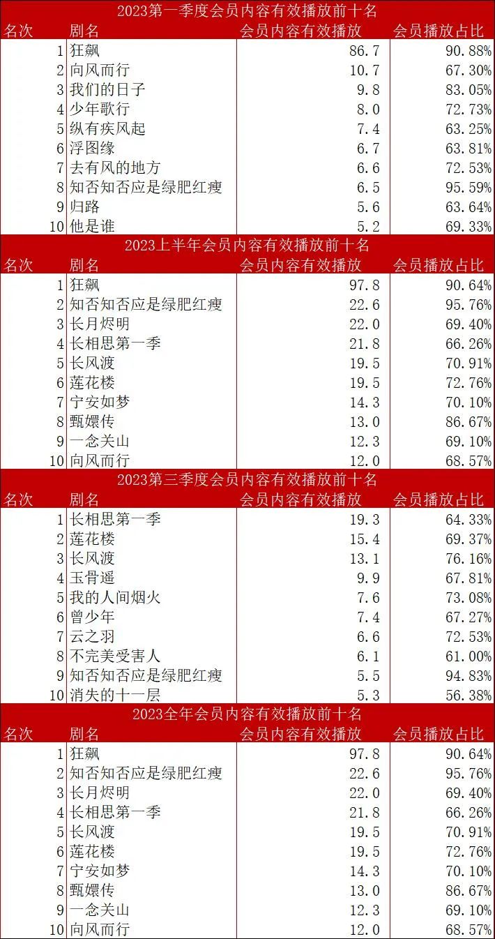 需要注意的是,2023年剧集市场的上述亮眼表现都离不开《狂飙》这一部剧的拉动作用。除了口碑与播放上的一路“狂飙”,在会员方面,《狂飙》真正做到了量价同升:经测算,《狂飙》将全年会员播放占比拉高了2个百分点;剔除《狂飙》影响后,2023全年会员播放占比为51%,与第四季度数值相一致。这再一次强调了真正的爆款作品所具备的对市场的正面影响能力。