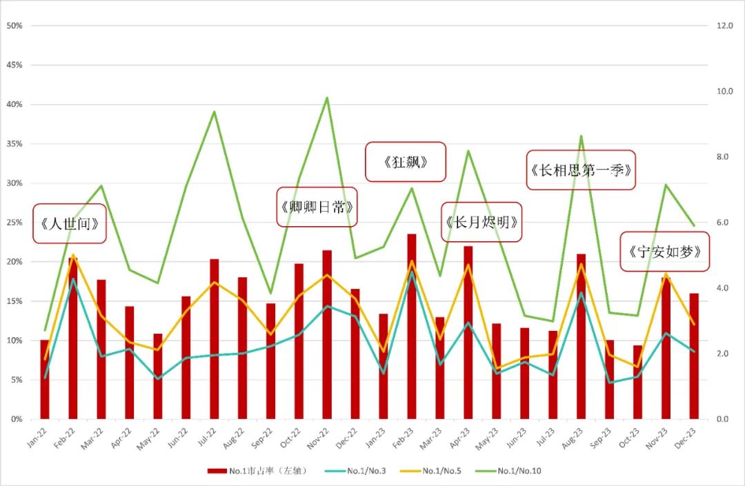 1)头部效应:比起市占率,市占率的相对值更重要。使用灯塔专业版公布的月度全网正片播放市占率排名,计算第一名与第三名、第五名、第十名的比值。与2022年时有市占“双头”的情况有所不同,2023年《狂飙》、《长月烬明》、《长相思第一季》等热门剧集播出时均为当时唯一爆款,市占率头部效应显著。