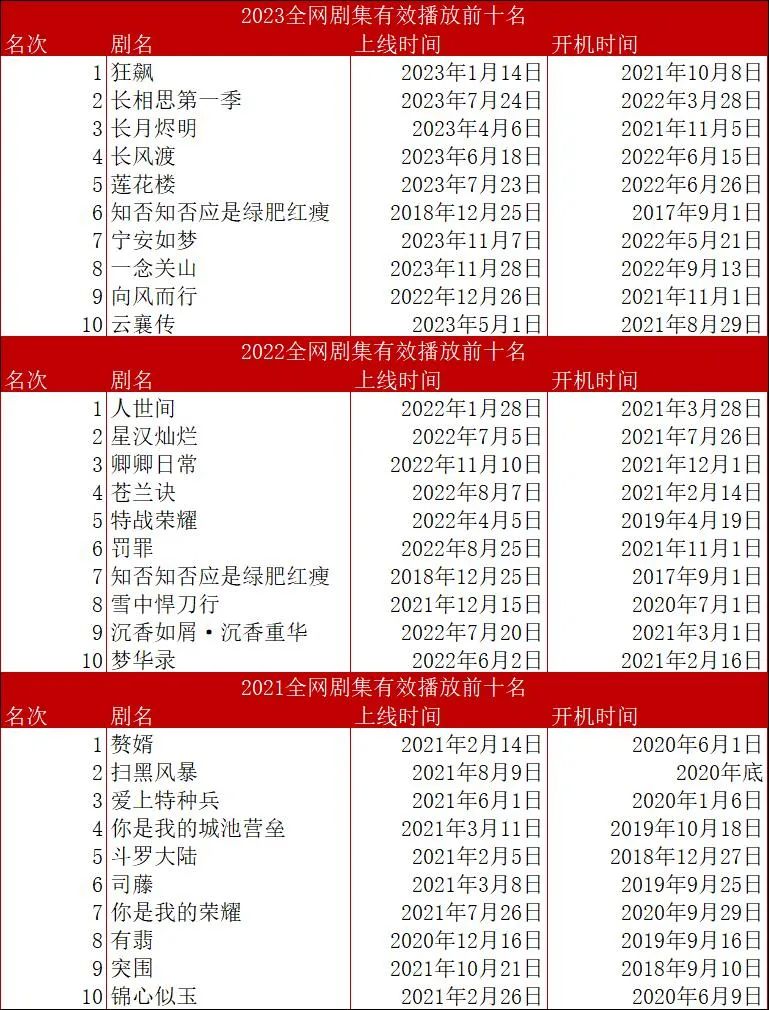 从库存周期来看,2023年的剧集市场存在着一个悖论:一方面来说,从开机时间来看,剧集市场仍在持续消化疫情期间的积压作品;另一方面来看,伴随着剧集市场提质减量、平台主动降本增效,每年上新速度锐减。受平台排播、演员情况、制作周期等多重因素影响,剧集市场的库存出清速度始终较低。