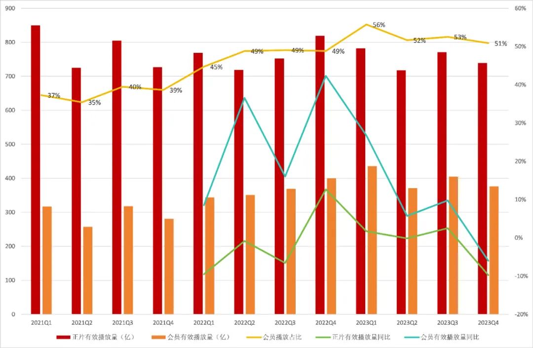 透视2023年的数据可以看到,与去年同期相比,会员有效播放增速较为显著,过去三年会员播放占比持续走高。这意味着精品战略的坚持得到了向好的商业转化。