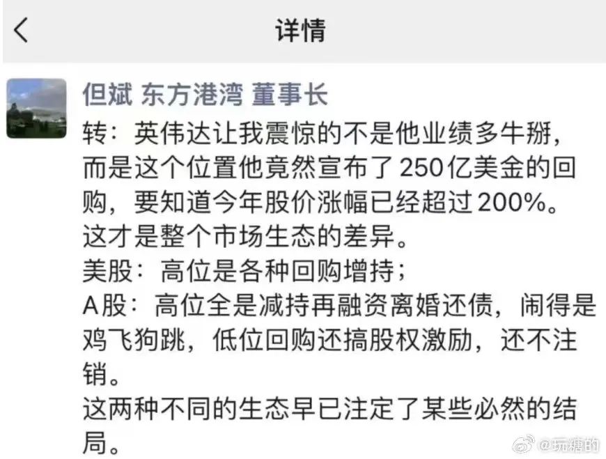有意思的是,此前东方港湾的董事长但斌,转发的一则内容显示:“在美股,高位是各种回购增持,但在A股,高位全是减持再融资离婚还债,闹得是鸡飞狗跳,低位回购还搞股权激励,还不注销。”