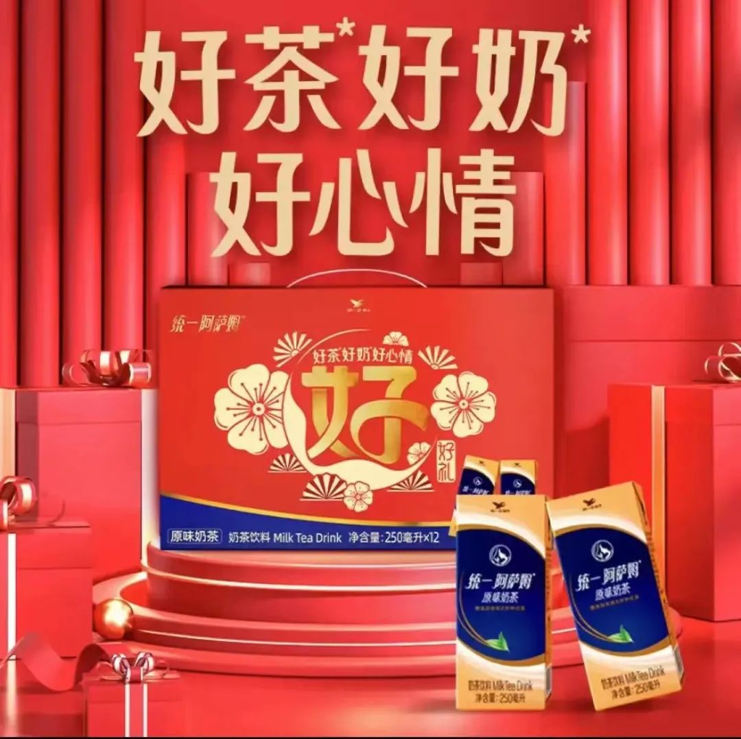 统一的礼盒产品大致可分为四类,以开小灶私房菜为主的家宴礼盒,主打预制菜场景;以元气觉醒100%的果汁礼盒,主打饮品场景;以TP装阿萨姆奶茶为主的礼盒,主打茶饮料场景,而2023年的畅销品和芝麻乳,今年也再度回归。