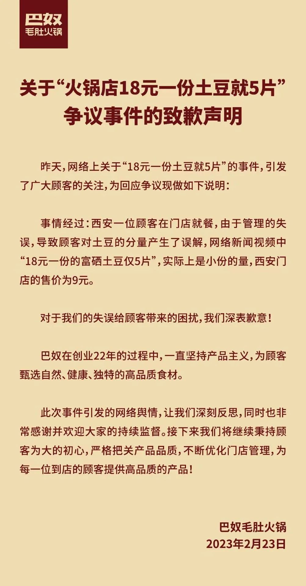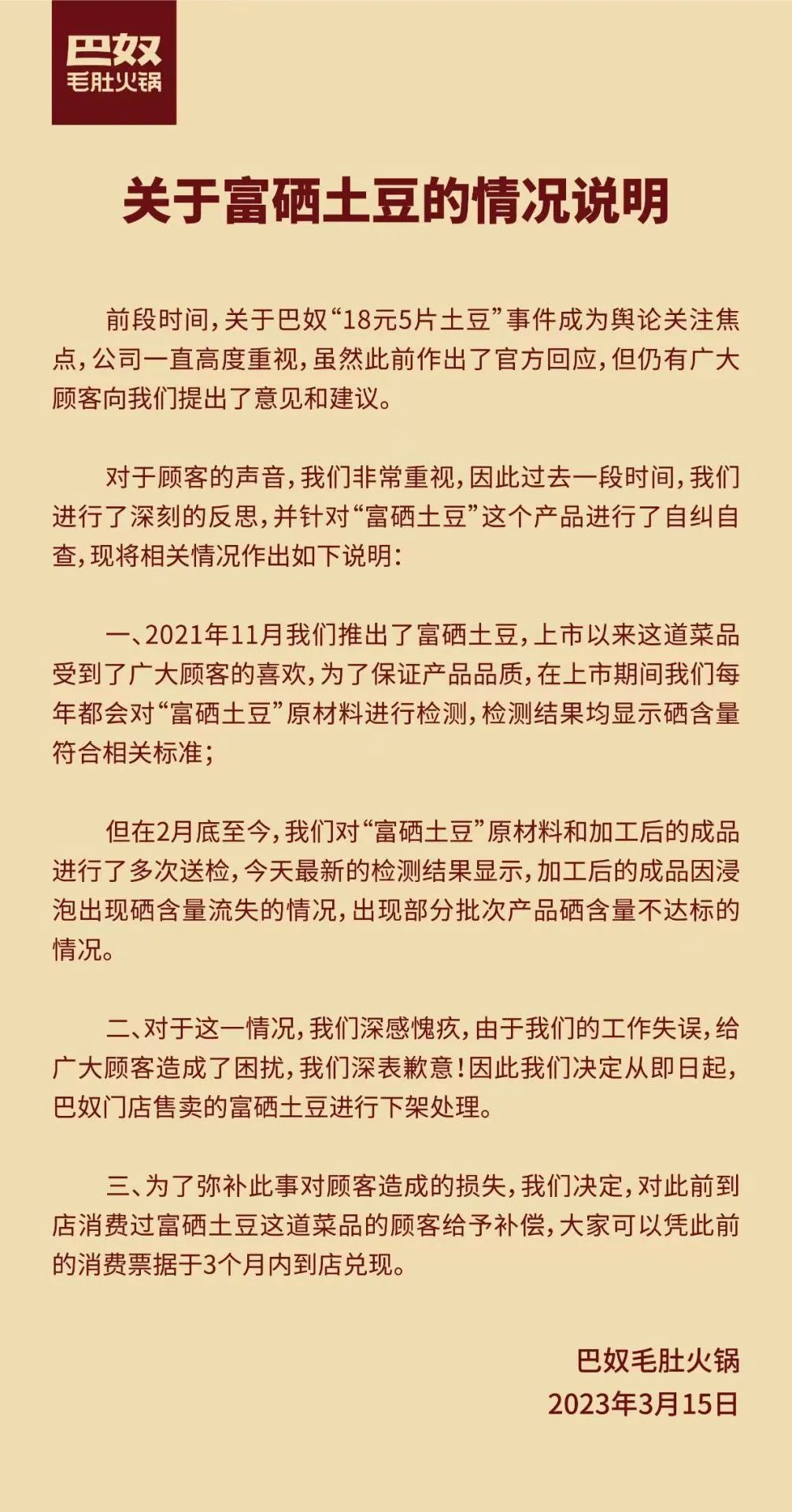 2023年伊始,巴奴火锅出售的“天价土豆”遭到网友吐槽。18元一份的富硒土豆只有5片,巴奴火锅后来虽解释说5片是小份的量,西安门店的价格是9元,但网友们并不买账,认为“富硒”、微量元素等指标并不易检测,商家以此为抬高价格的噱头,很难令消费者信服,且据调查,电商平台上富硒土豆的价格一斤单价均未超过5元。