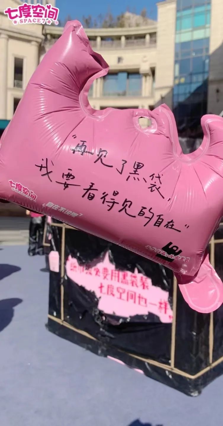 2023年,国际三八妇女节,七度空间推出的“黑袋空间”特别展览,通过撕开被黑袋包裹的一件件巨型日用品,告诉大家卫生巾也只是普通的日用品,就像一瓶水、一包纸一样。