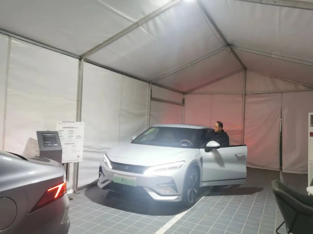 日前,在走访市场时,记者看到一家比亚迪4S店门前停放着未上牌的新能源车型和试驾车辆。前来看车的消费者并没有推开4S店的大门,而是径直走进了旁边的白色帐篷内。