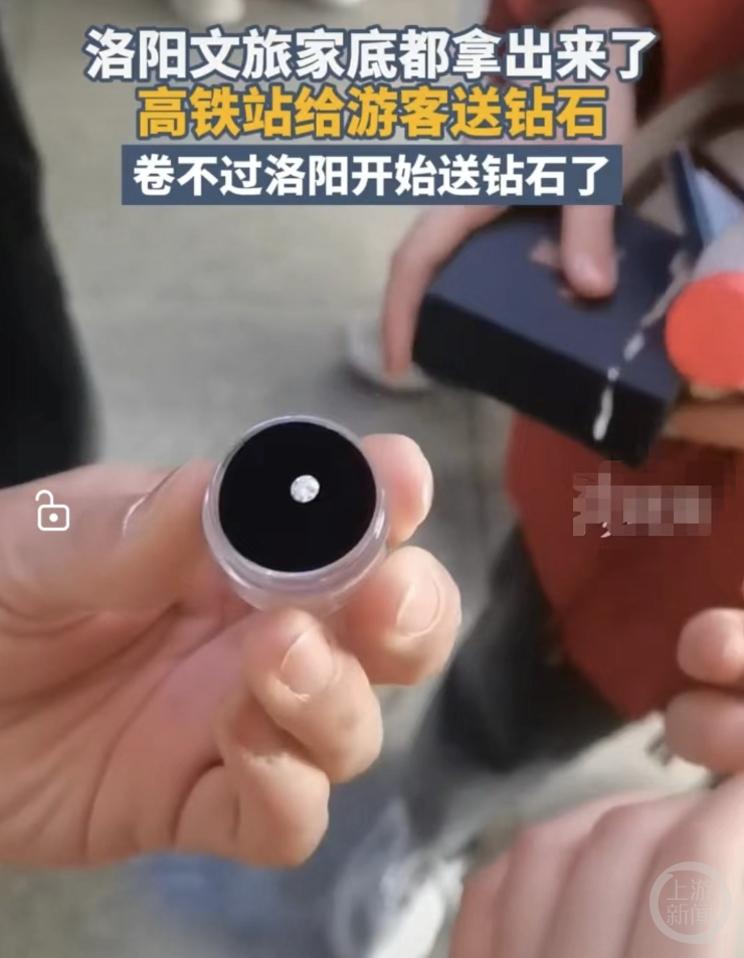 从1月14日起,游客从洛阳火车站出站后,根据引导先回答当地文旅相关问题,答对了,就可以获得一颗人造钻石,大小不一,最大的有1克拉。活动的第一天,洛阳文旅局就送出了100颗钻石。