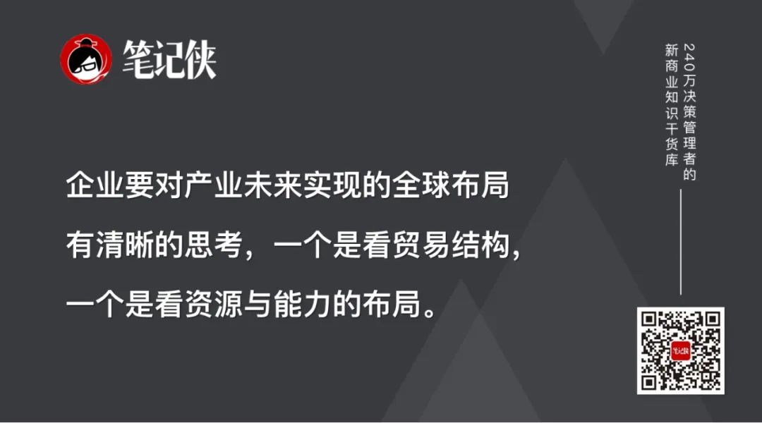 企业要对产业未来实现的全球布局有清晰的思考,一个是看贸易结构,一个是看资源与能力的布局。