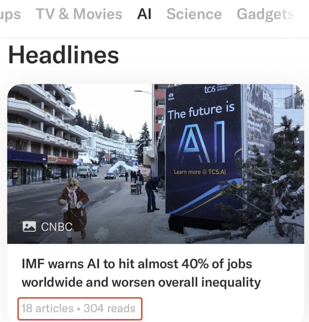 比如「AI」分类下的「国际货币基金组织称 AI 将影响全球约 40% 的就业岗位」,集合了 18 篇报道,让读者更加深入和系统地了解这一信息。