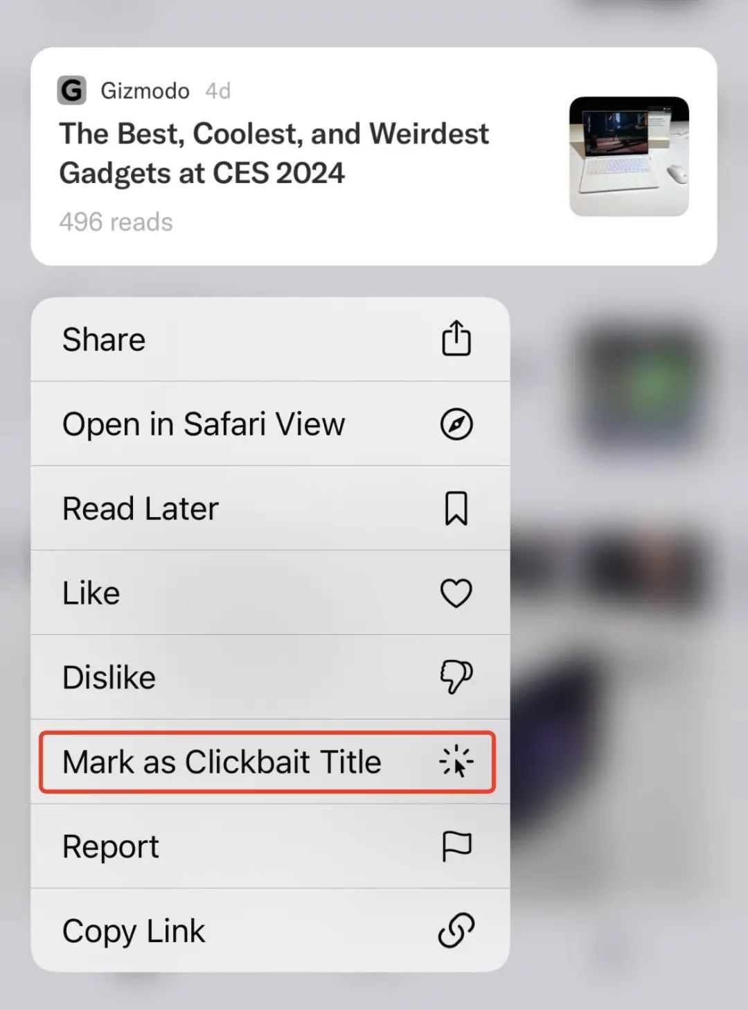 另一个是杀死标题党的 AI 功能,用户可以长按出现在信息流的文章,报告某篇文章文不对题,反映的人多了,这篇文章显示在信息流里时,标题会用 GPT-4 重写。