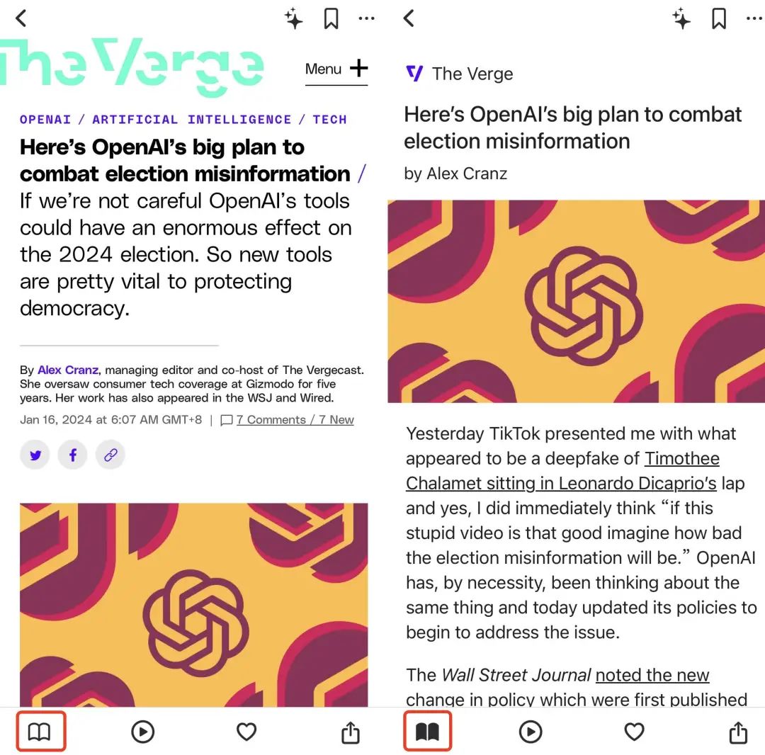 如果打开「全页阅读」模式,可以去掉原来网页的广告等不相关信息,阅读体验更加清爽和沉浸。