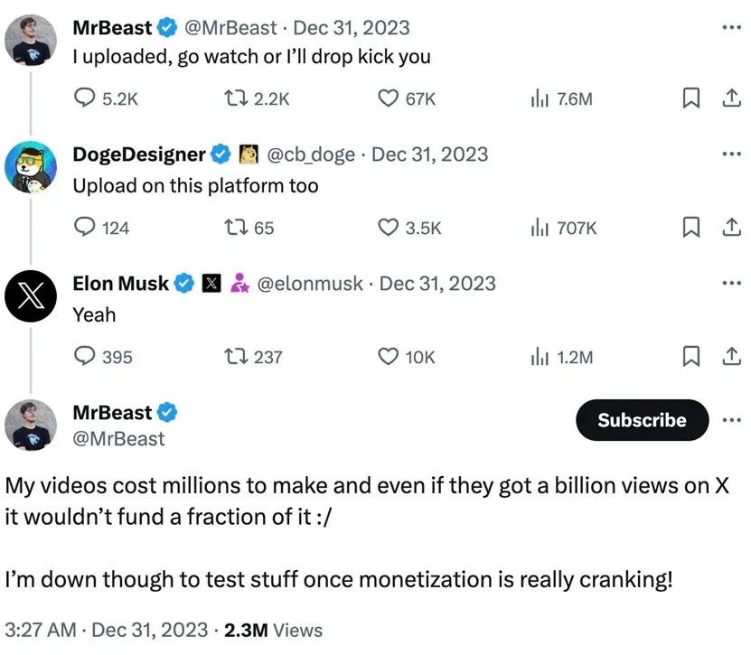 也难怪前些日子马斯克在平台上喊话 YouTube 知名网红 MrBeast 将视频上传到 X 平台上时,得到的回应是,即使他的视频在 X 上获得 10 亿观看量,获得的收入也不及视频制作成本的零头,所以他现在没法将视频上传到 X 平台上。广告收入大跌,连自己都养不活的 Twitter,目前自然没法分给创作者太多钱。