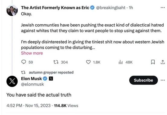 加之马斯克个人的口无遮拦,加剧了广告主的逃离。例如 11 月底被扣“反犹太主义帽子”,一个多月造成了大约 7500 万美金的损失。为了钱终于低下头道歉的马斯克,在之后又炮轰广告主。各种行为也很典型。