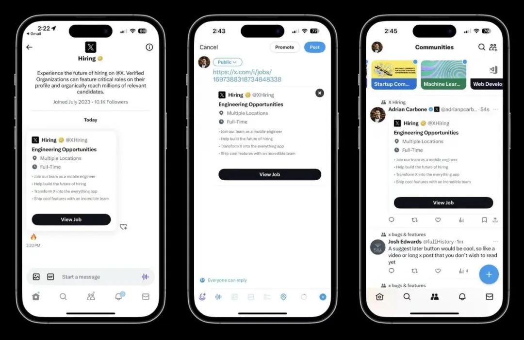 而招聘网站 X Hiring 也是 X 公司自己运营的,整个服务包含在企业认证服务的订阅权益中。由于 X 上汇集了大量的公司、创业者、投资人等,而且目前 X 也是整个商业、科技领域信息交流的最大平台,选择招聘场景进行尝试,也算是做自己擅长的领域了。