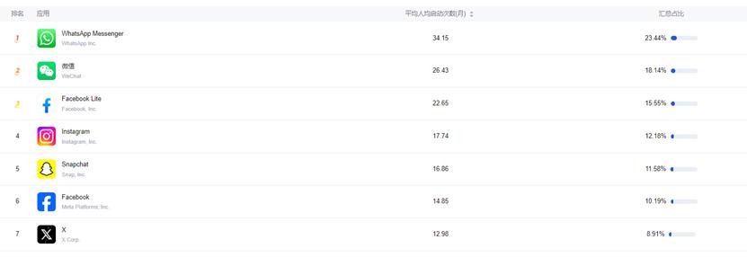 因为这种限制,Twitter 上的内容相比其他平台更加的正式,用户浏览行为更加“短平快”。从数据来看,X 的全球人均启动次数和人均使用时长在主流产品中都排名靠后。
