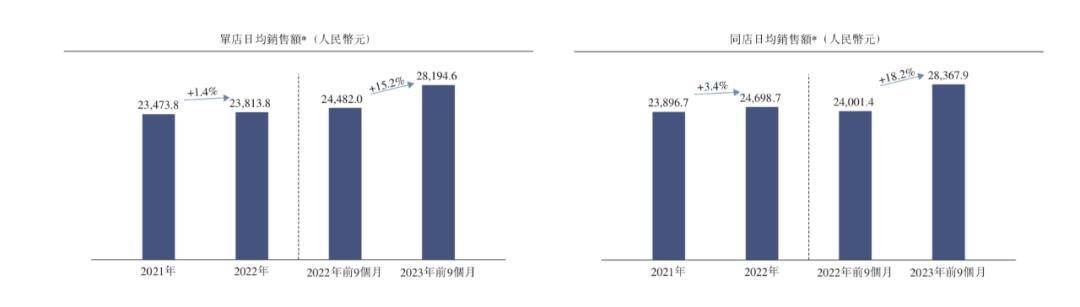 此外,2023年前三季度,“小菜园”门店的同店销售同比增长22.3%,堂食顾客总数同比增长36.8%,同店堂食顾客总数同比增长15.9%;2023年前三季度,“小菜园”的单店日均销售额同比增加15.2%至28,194.6元,同店日均销售额同比增加18.2%至28,367.9元。根据弗若斯特沙利文的资料,上述增幅均领先于行业水平。