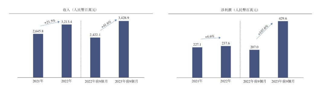 财务数据方面。2021年和2022年,小菜园的营收分别为26.46亿元和32.13亿元,净利润分别为2.27亿元和2.38亿元。2023年前三季度,小菜园的营收从2022年同期的24.22亿元增加41.6%至34.29亿元,净利润则从2022年同期的2.07亿元增加107.6%至4.30亿元,2023年前三季度的净利润率为12.5%。根据弗若斯特沙利文的资料,小菜园的净利润率在大众便民中式餐饮市场中居于领先水平。