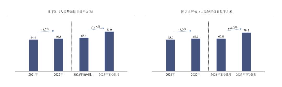 在坪效及人效层面。“小菜园”门店日坪效由2022年前三季度的68.4元增长18.5%至2023年同期的81.0元;同店日坪效由截至2022年前三季度的67.0元增长18.3%至2023年同期的79.3元;月人效由2022年前三季度的22,696.0元增长16.9%至2023年同期的26,527.6元;同店月人效由由2022年前三季度的22,856.9元增长18.4%至2023年同期的27,073.2元。