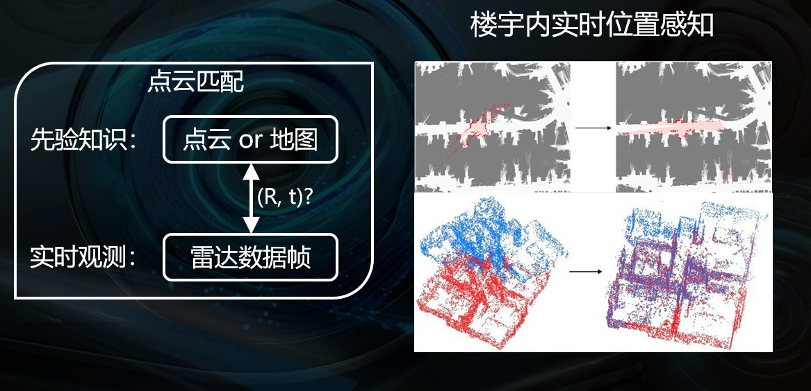用通俗的话来讲就是定位,因为我们知道楼宇当中,有一个技术挑战就是GPS、北斗等等这样的定位信号是被屏蔽的,有些情况下是没办法使用的。尤其像现在我们国家从国家安全角度考虑,有一些大的地下停车厂或者掩体,本身也有定位需求,最直观的,我们找车位的时候,室内没有GPS信息,这个时候使用激光雷达本身高精度测量信息是一个主流的方案,这是目前机器人当中为什么非常广泛使用激光雷达的原因,就是用了激光雷达配准的功能。这个功能不单单只是用在机器上当中,像我们刚才提到的空间测量、测绘的时候同样用到这样的技术,它的使用手段不是用在机器人,而是人本身背着机器就可以实现定位。