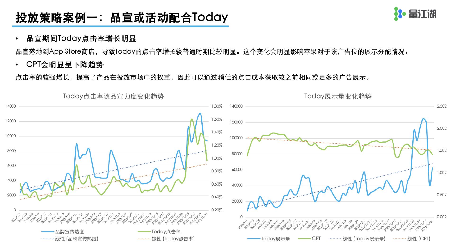 左图告诉我们,品牌宣传的热度,直接拉动了Today广告的点击率。品宣热度逐步递增,Today点击率也一路攀升。从右图可以看到,品宣期间,得益于点击效率的利好,Today拿到更多展示量级,且点击成本也被很好地控住了。