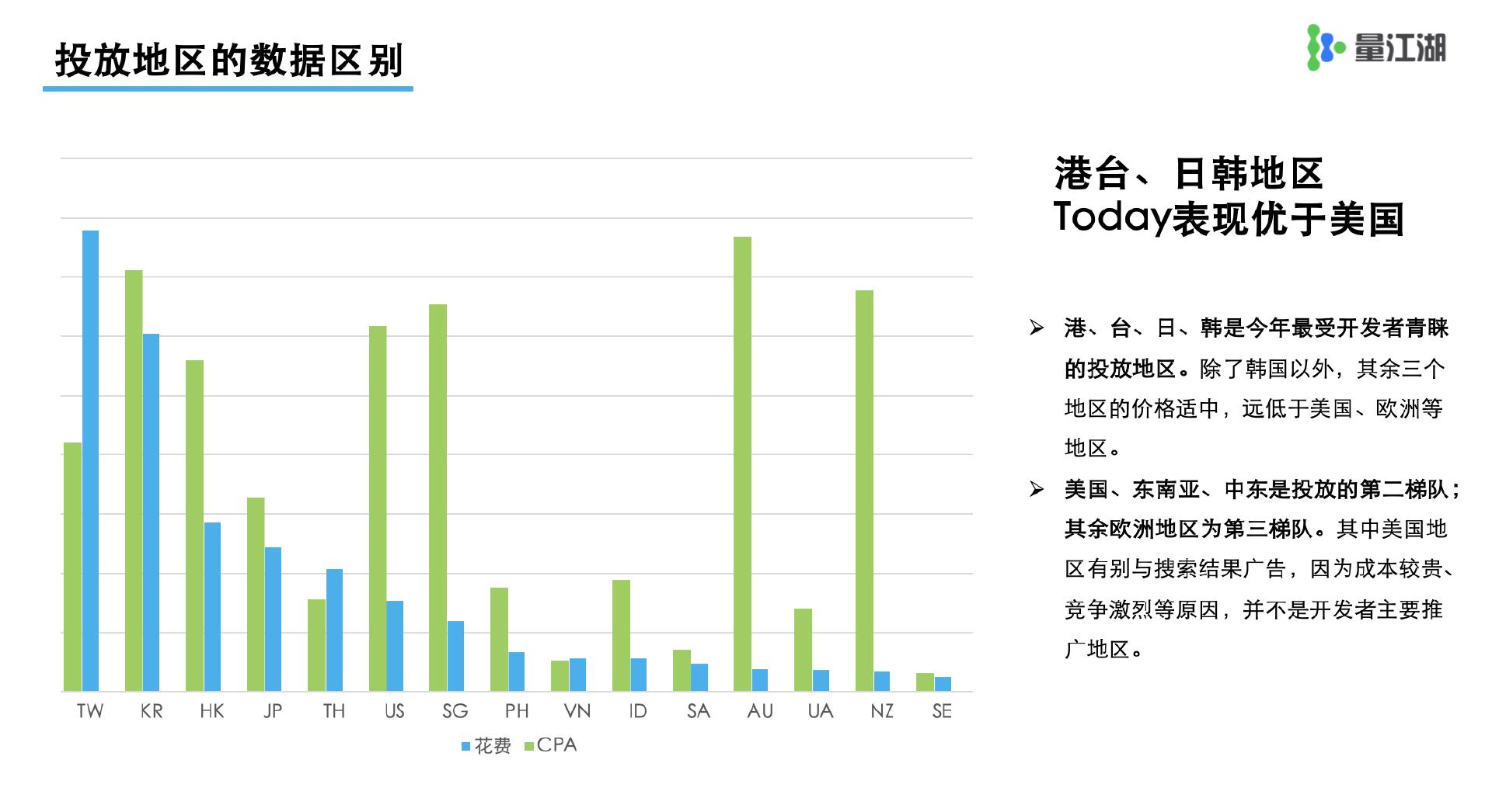 由于人口数量和竞争情况的不同,海外不同市场的获量打法也不同。人口多盘子大的地方,能同时长期投放Today产品数量也多,比如美国,大家就倾向于长时间投放慢慢洗,相应成本也贵;而日韩港台地区,盘子较小,大家则倾向于洗完一遍就走。