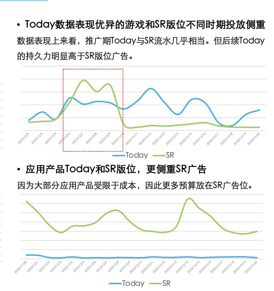 应用类产品的转化率相较于游戏有明显的转化优势,成本表现也更好。虽然游戏产品通常都会在推广期去抢占Today流量,但如果应用产品能够“错峰投放”,也是有机会拿到很不俗表现的。