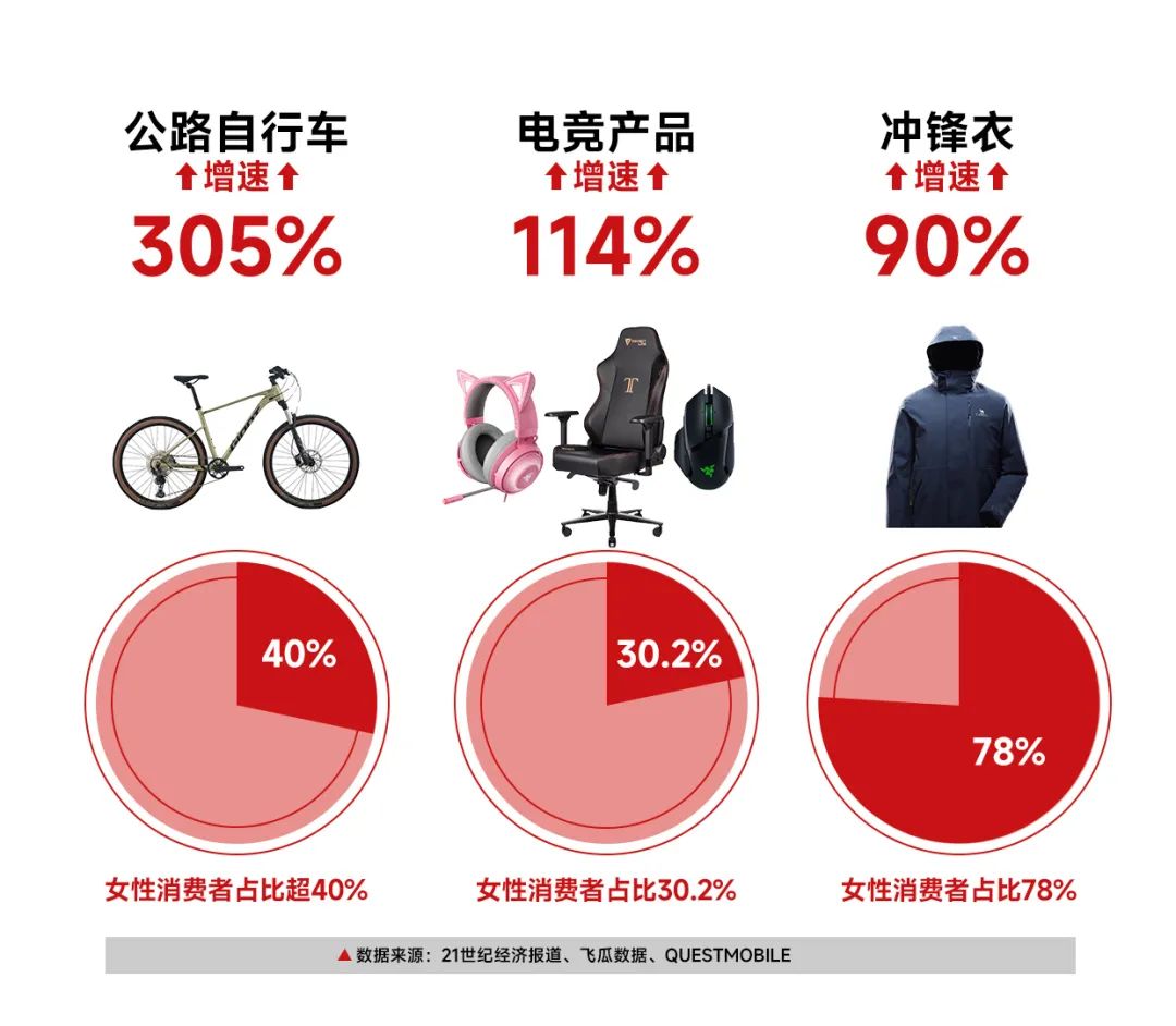 而原本以男性消费为主的品类,如体育鞋服、酒水饮料和电竞游戏,反倒伴随着潮流趋势与品牌的主动渗透,让女性以更高的增长速率占据一席之地。