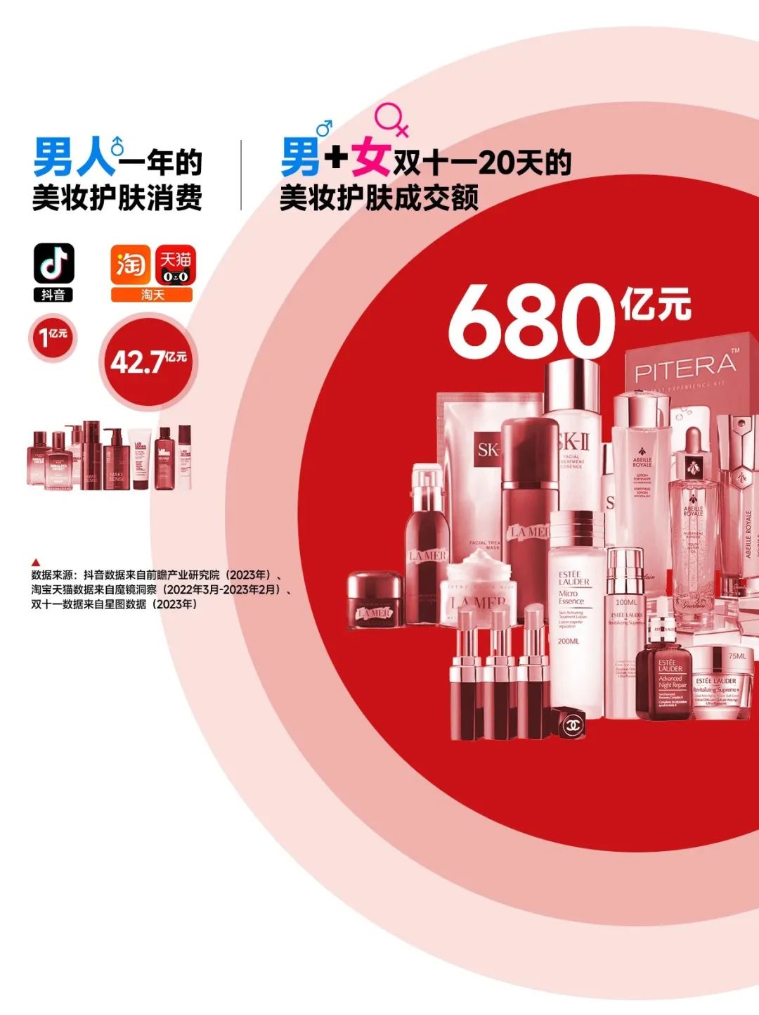 但如果再看两组整体数据:在抖音,男士美妆护肤销售额仅超过1亿元(蝉魔方,2023年),淘宝天猫则为42.7亿元(魔镜洞察,2022年3月-2023年2月)。什么概念?整个2023年双11,各大电商平台美妆个护整体销售额680亿元,其中天猫占比61.6%,抖音占比32.6%(星图数据)——男士一年到头花在脸上的钱,还不及女士在一个双11买的多。(点击《抖音双11榜单:珀莱雅赢了欧莱雅,回力打败安踏》)