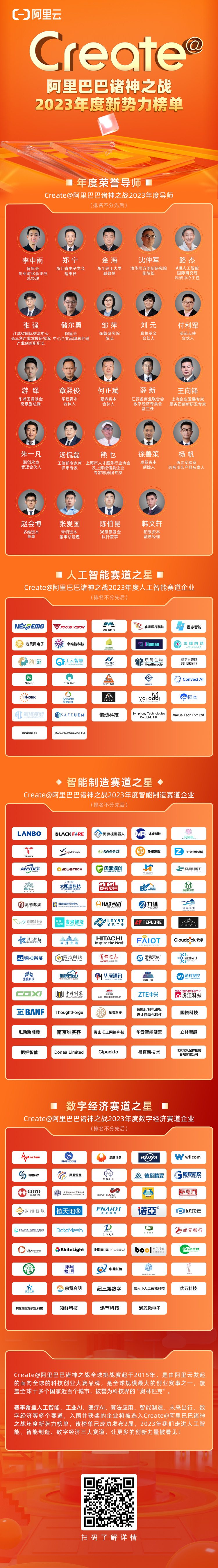 此外,除企业榜单外,阿里云同步发布了Create@阿里巴巴诸神之战2023年度创业导师,由知名创投机构投资人、行业专家、技术专家等组成的24位荣誉导师上榜,阿里云将与众多导师一起,长期关注及助力创新企业成长。