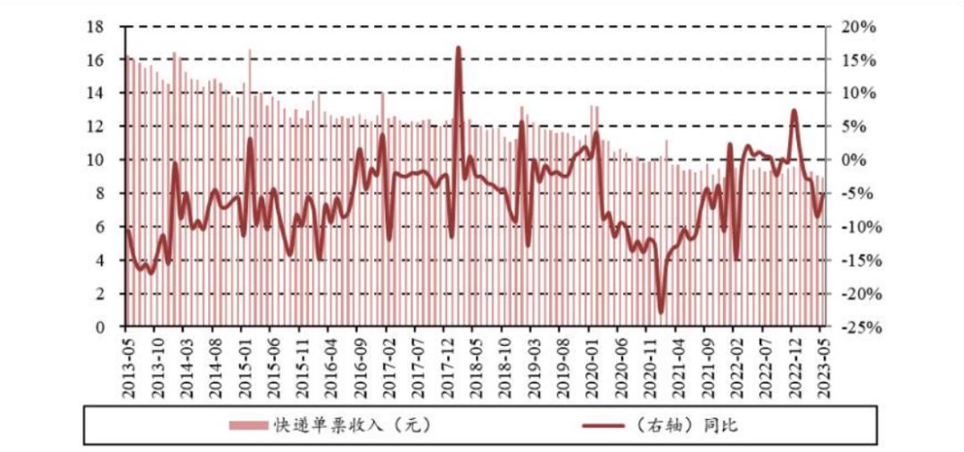 根据中银证券研报数据,近十年来,国内快递单票收入持续走低,已从2013年的16.29元降至2023年的8.94元。