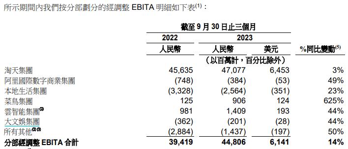 在剩余的各项业务集团中,菜鸟集团同比增长25%,乍一看处于中规中矩的水平。不过,在盈利方面,国际数字商业、本地生活和大文娱三大集团仍陷亏损,而阿里云和菜鸟则已实现盈利,两者经调整EBITA利润分别达到了14.09亿元与9.06亿元。
