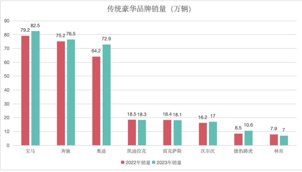 在2023年,一线豪华品牌的市场表现较为乐观,宝马、奔驰、奥迪三大品牌销量均有所增长。