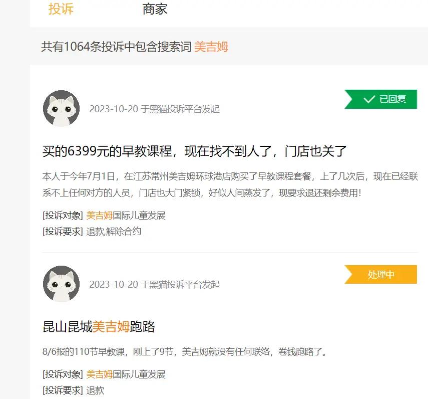 在黑猫平台上,关于美吉姆关店无法消课的投诉,就高达1100多宗。