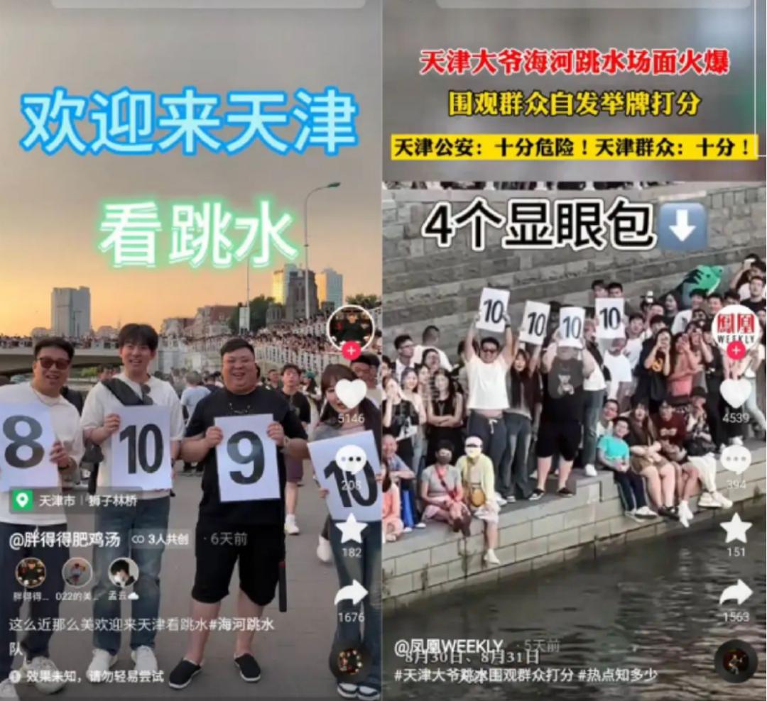 实际上,狮子林桥是天津本地游泳爱好者的聚集地,很多大爷们都已经在这里跳了很多年了。只不过以前没有这么多人关注,如今被网友拍成短视频发到社媒平台上就迅速火了。根据公开数据显示,天津大爷跳水抖音相关话题累计播放量超10亿,快手相关内容播放量超1.8亿,小红书相关内容浏览量超5000万。难怪有网友戏称“淄博是用烧烤拴住了大家,天津则是用大爷拴住了大家”。