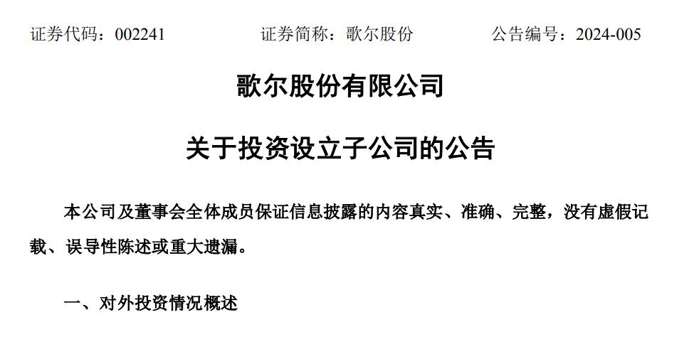 1月15日晚间,歌尔股份宣布,公司全资子公司拟以自有资金在越南设立全资子公司,投资总额不超过2.8亿美元(约人民币19.9亿元)。