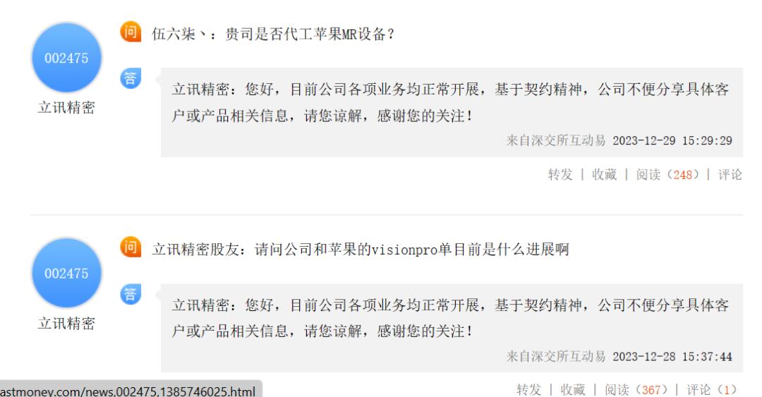 另外一边,歌尔股份的“老朋友”立讯精密(002475.SZ)与苹果VisionPro的合作情况也受到投资人关注。华安证券在近日发文分析称,立讯作为大客户 MR 产品核心供应商,将会充分受益于这一轮创新周期。