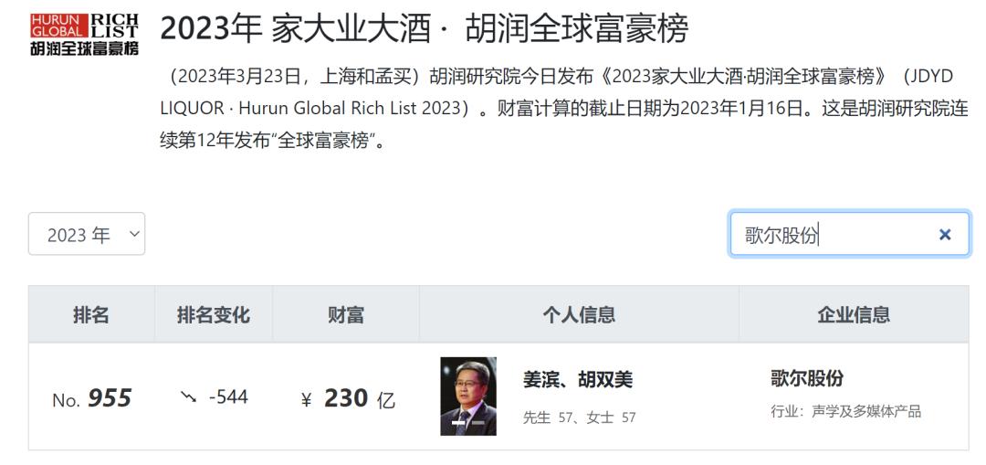 歌尔股份成立2001年,由山东人姜滨下海创立,历经20余年发展成长为苹果供应链明星企业、国内消费电子行业龙头,一度稳坐“果链龙头”位置,实控人姜滨夫妇也借此成就230亿身家。