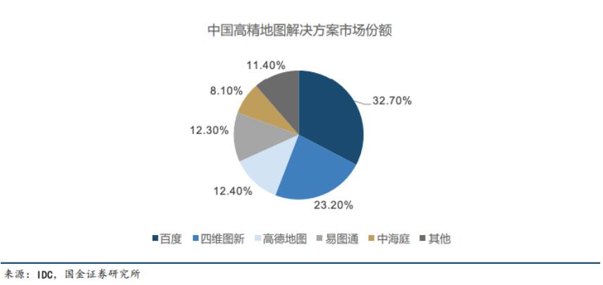 国金证券研报数据显示,2021年中国高精地图解决方案市场份额,百度第一,四维图新第二,两家合计占了超过一半的市场份额。