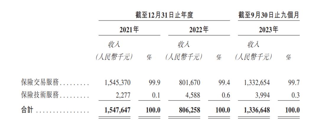 据招股书,2021年、2022年及2023年前9个月,手回科技保险交易服务收入分别为15.45亿元、8.02亿元及13.33亿元,占总营收的比例分别为99.9%、99.4%及99.7%。而保险技术服务的收入占比比较低。