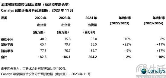 近日在调研机构Canalys发布的《2024年全球可穿戴设备分析预测》中显示,2023年全球可穿戴腕带设备总销量达1.86亿台,得益于新兴市场(主要为印度)的销量上涨,整个市场总体增长2%。其中,基础版智能手表的出货量大幅提升22%,抵消了智能手表与智能手环9%的下滑。