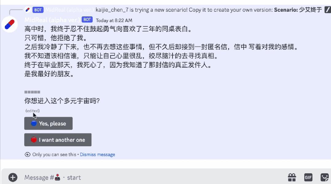 和其他Agent技术公司不同,陈锴杰的初衷和目的更为明确,即通过Agent为用户创造新的游戏体验和娱乐模式。据透露,其团队已经和国内Top游戏公司签订合作,正在探索Agent+游戏的更多可能性。团队发布的游戏化产品midreal.ai近日也在海外出圈,在Discord中为玩家提供了“爽文级”的图文互动体验,玩家只要输入一句世界观,就能看到一个充分满足自己幻想的故事。