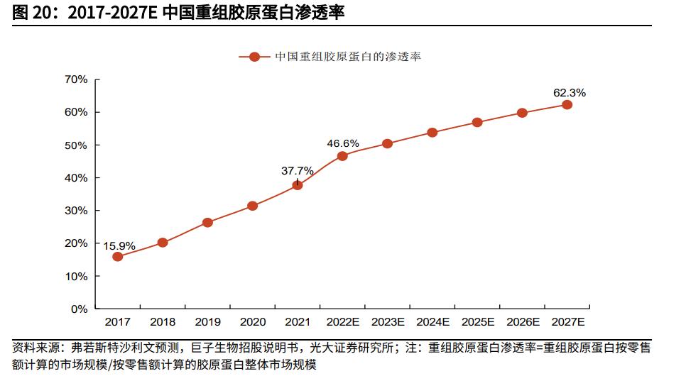 据弗若斯特沙利文预计,中国重组胶原蛋白市场规模将从2021 年的108亿增长至2027年1083亿元,渗透率也将达到胶原蛋白领域的62.3%,未来增速可观。对比之下,当前该产业仍处于初期。