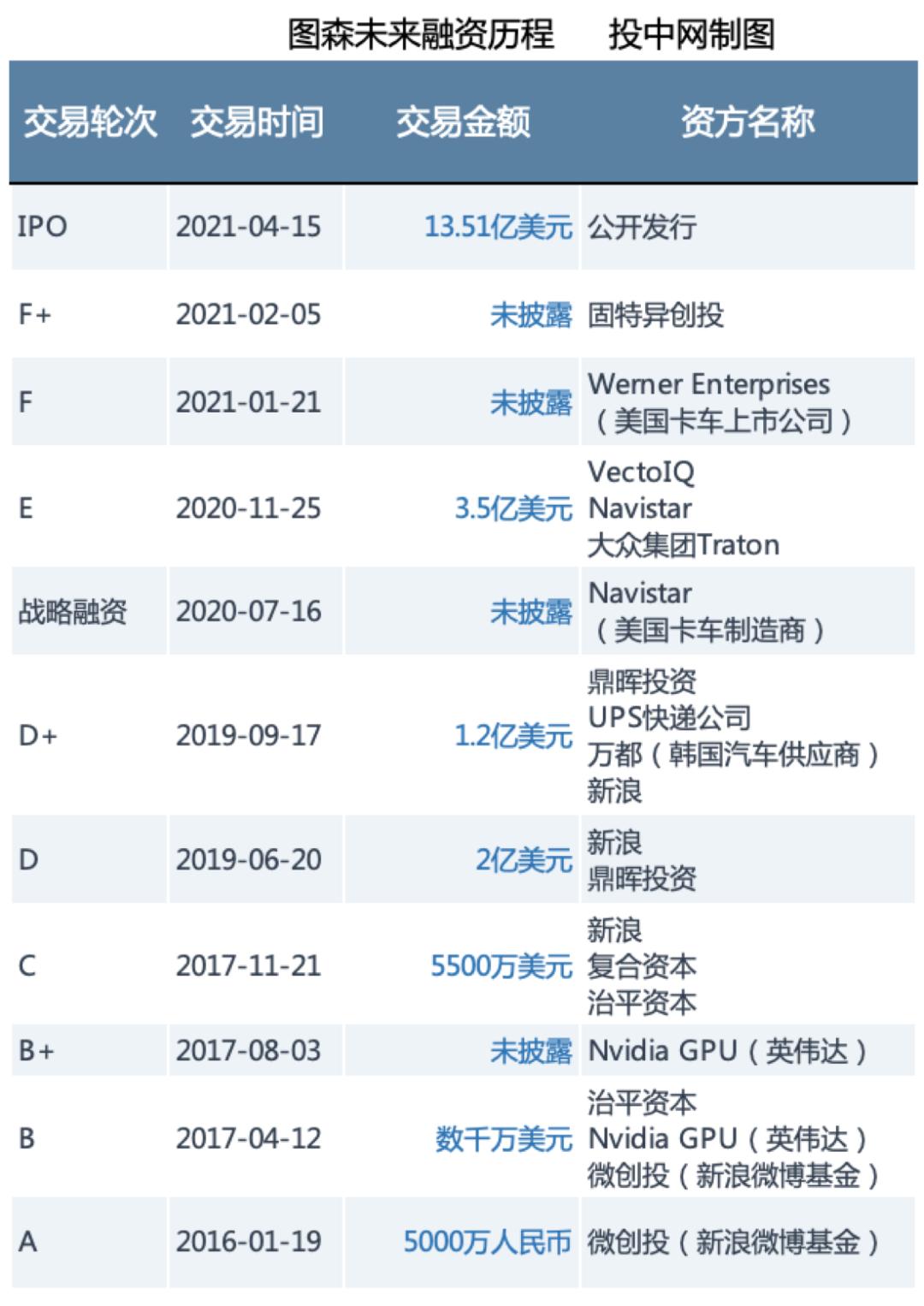 上市前,多家产业巨头、互联网大厂、明星资方轮番加注。根据CVSource投中数据, IPO前,图森未来一共完成过10轮融资,累计融资额超8亿美元。投资方包括新浪、英伟达、UPS、Navistar、韩国汽车一级供应商万都、大众集团TRATON、鼎晖投资等。