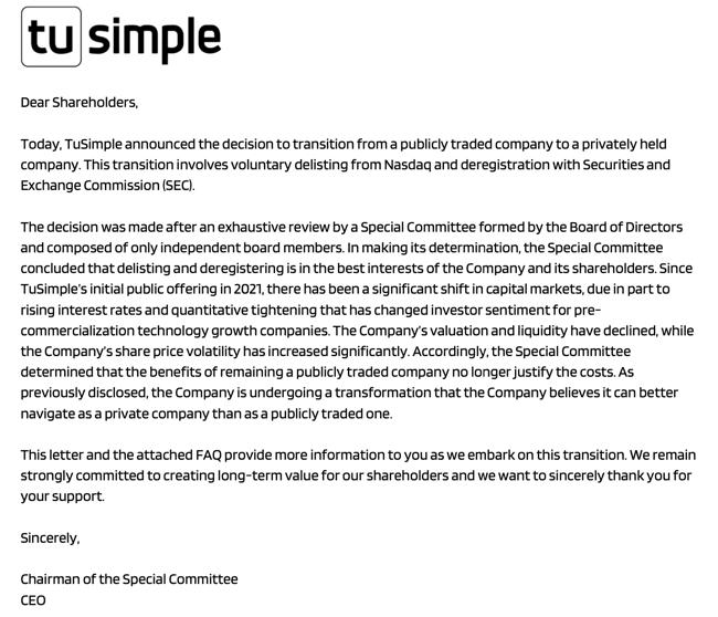 因此,董事会认为,继续公开上市的益处不再。图森未来正在经历一场转型,公司相信作为一家非上市公司比作为一家上市公司能够更好地进行转型。