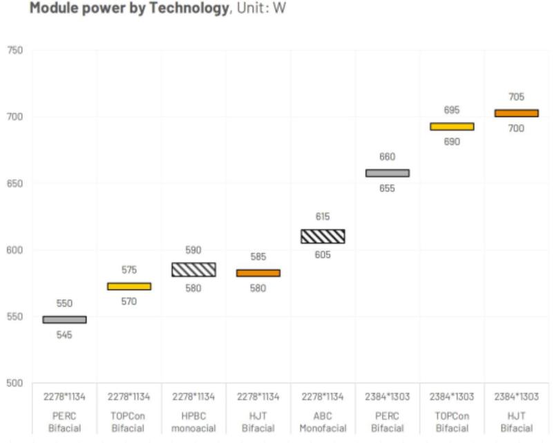 对比不同技术路线同样板型组件的功率,PERC电池组件功率大概550W,TOPCon能做到570W,HPBC会更高一点,大概580-590W,异质结也会比TOPCon高10W左右。总体来说,异质结转换效率比TOPCon略高。