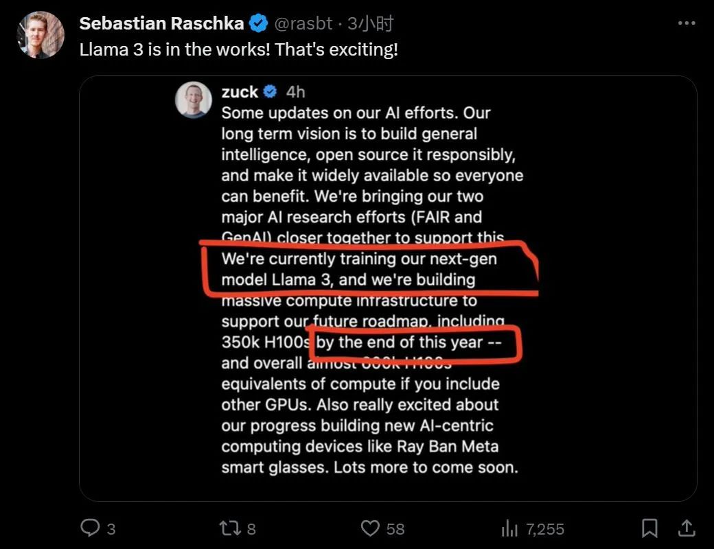 今年底获得等效 60 万 H100 算力,那么现在正在训练 Llama3 的 Meta 已经拥有了多少算力?人们纷纷进行了猜测。