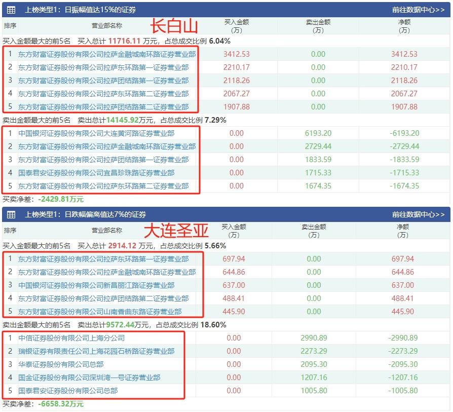 在长白山成交明细中更为明显,多为“拉萨天团”的反复拉扯,单日换手率19.59%,成交量52.24万手,成交额达19.4亿元。